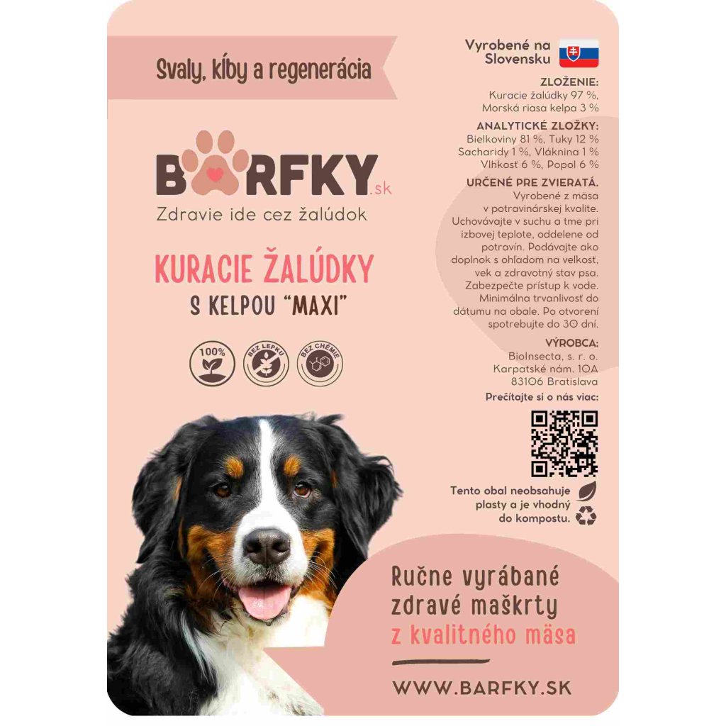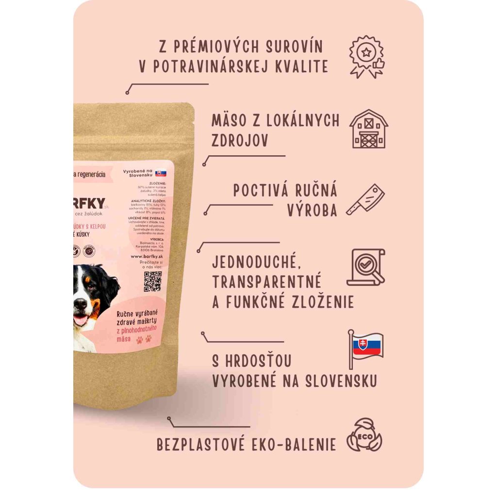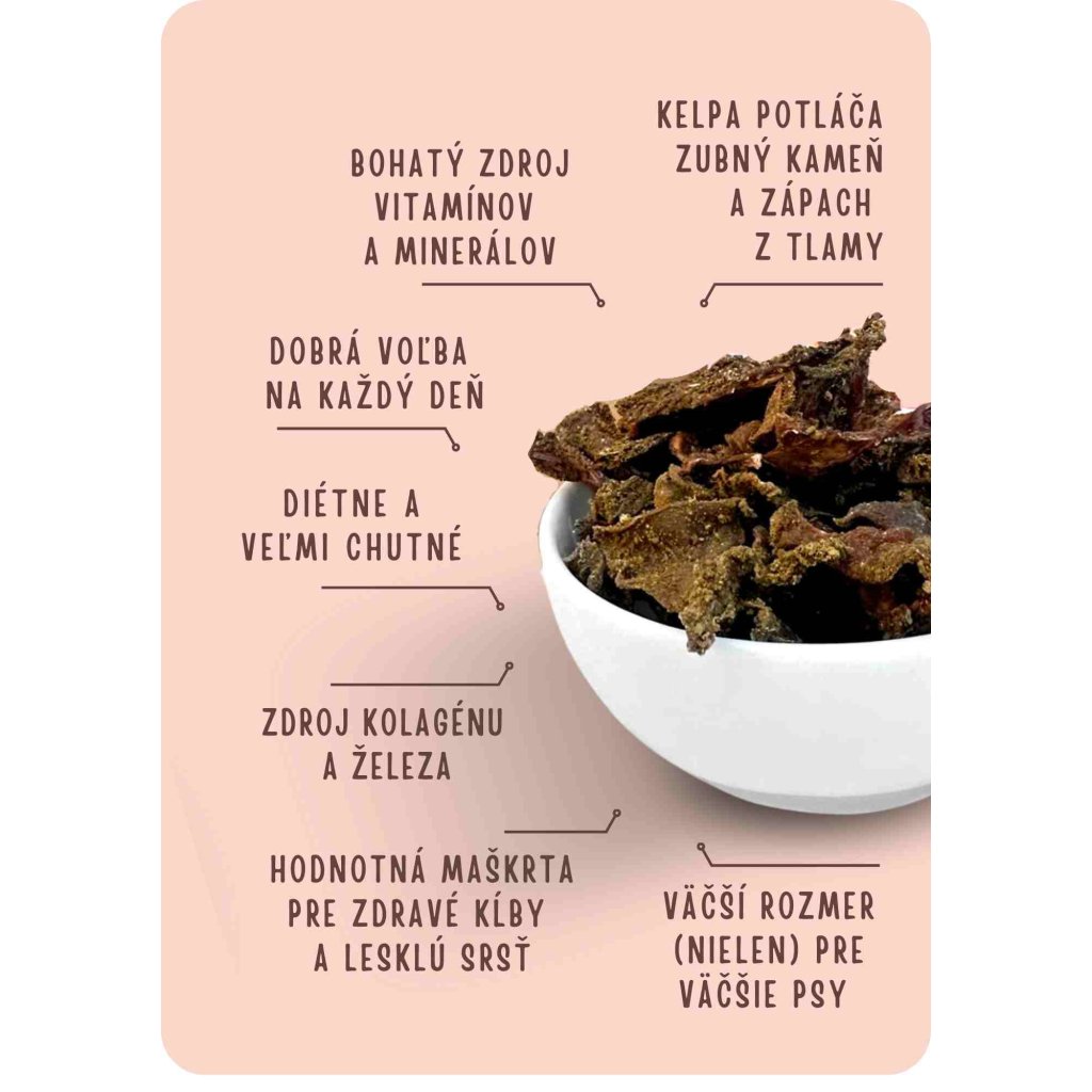 Ručne krájané kuracie žalúdky obaľované v kelpe a sušené teplým vzduchom. Veľkosť 1 kúska cca 4 - 6 cm. Vzhľadom na väčší rozmer vhodné pre väčšie plemená psov, prípadne ako väčšia odmena (pochúťka) pre menšie psy. Čisto prírodný produkt.